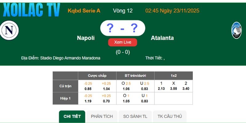 Để mang đến cái nhìn tổng quan nhất cho người hâm mộ, dưới đây là bảng tổng hợp các tỷ lệ kèo phổ biến cho trận đấu giữa Napoli vs Atalanta, được cập nhật từ các nhà cái uy tín.