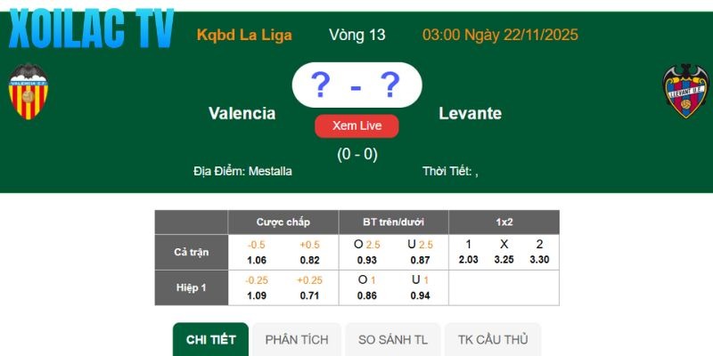 Để có cái nhìn tổng quan hơn về những đánh giá từ giới chuyên môn, chúng ta cùng tham khảo bảng tỷ lệ kèo cho trận đấu này.Soi kèo Valencia – Levante chi tiết.